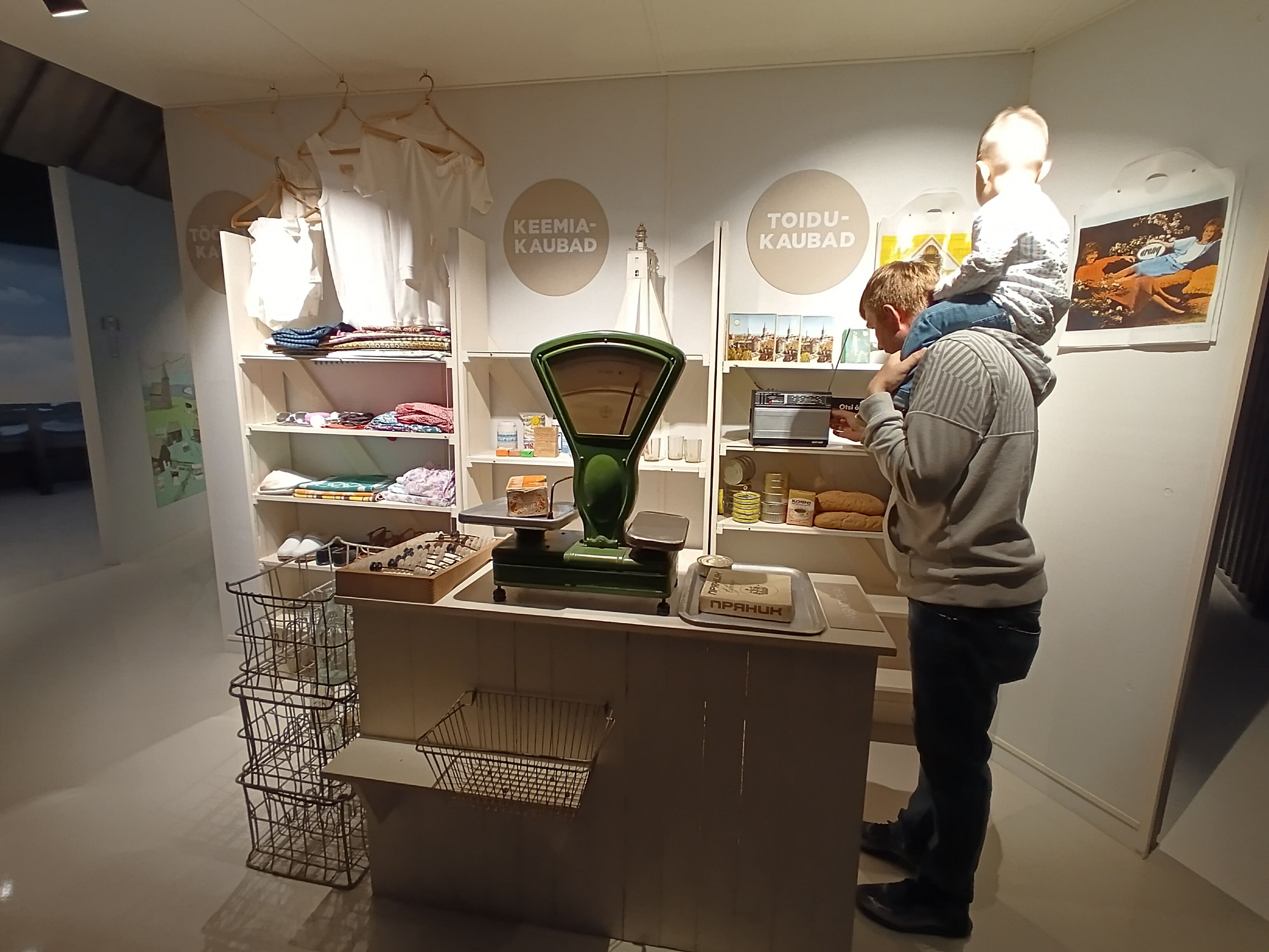 大きなはかりに、そろばんとレトロなラジオがありました。