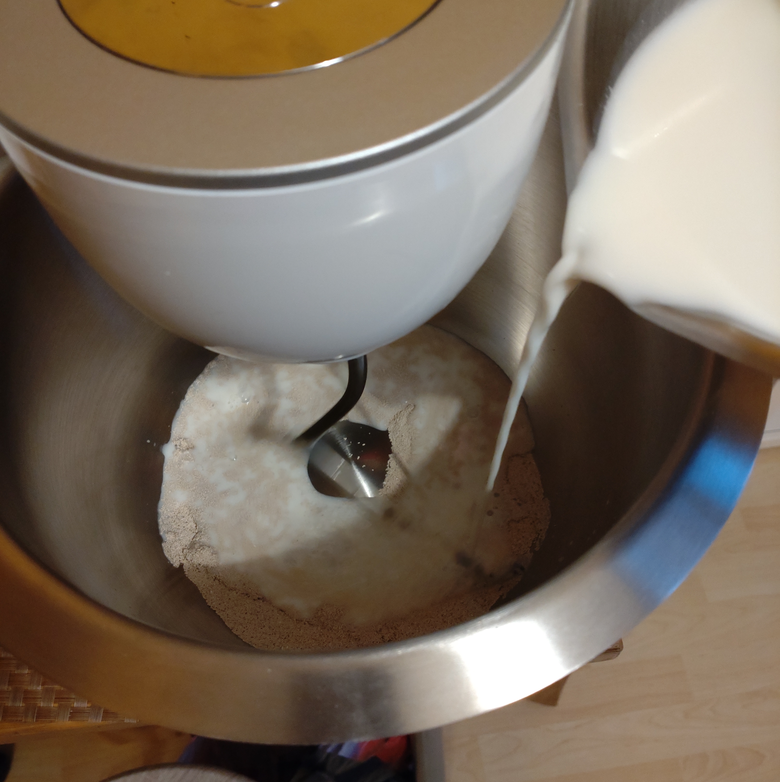 - ドライイースト、砂糖、塩を合わせ、混ぜながら牛乳を加える。