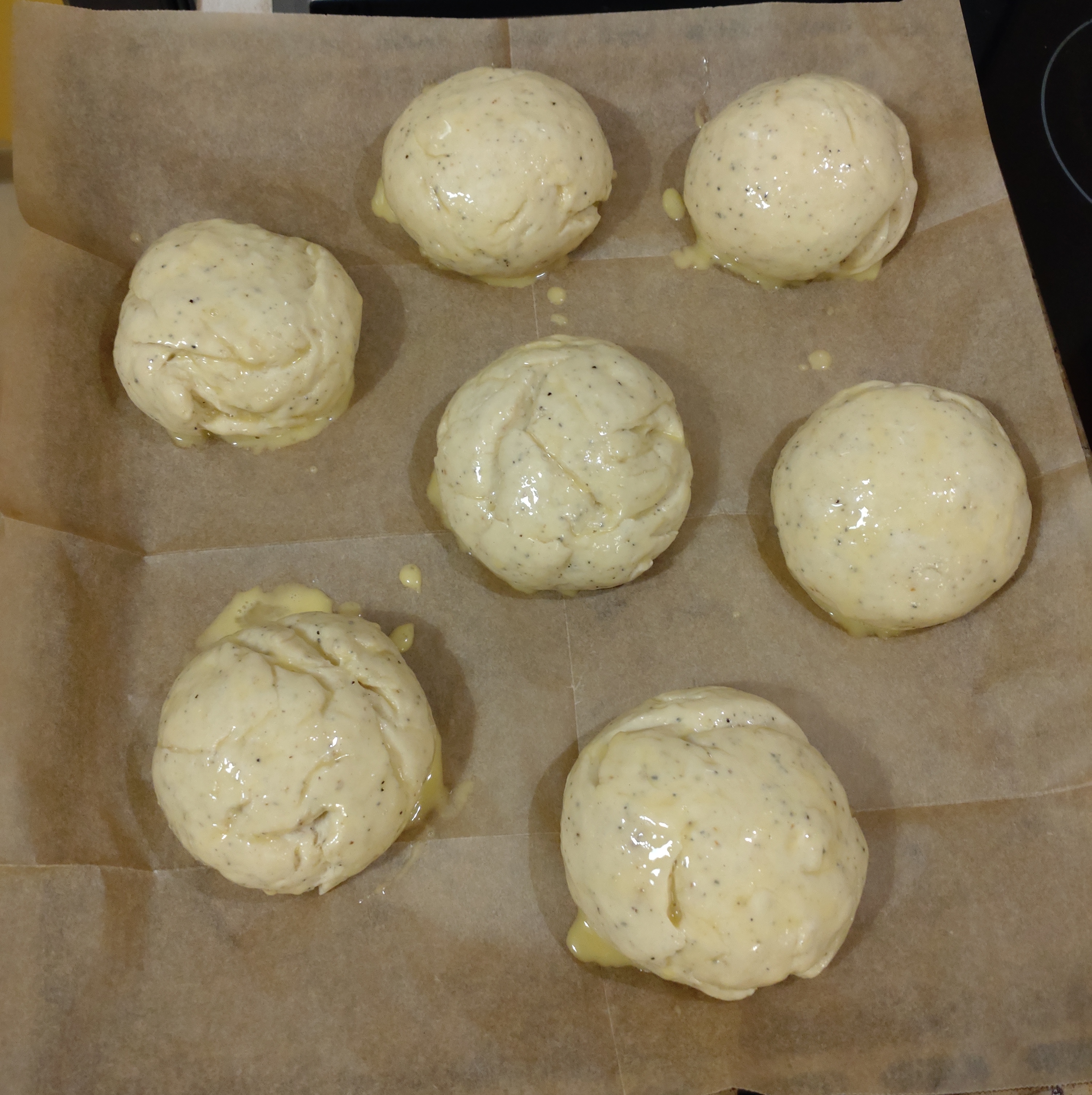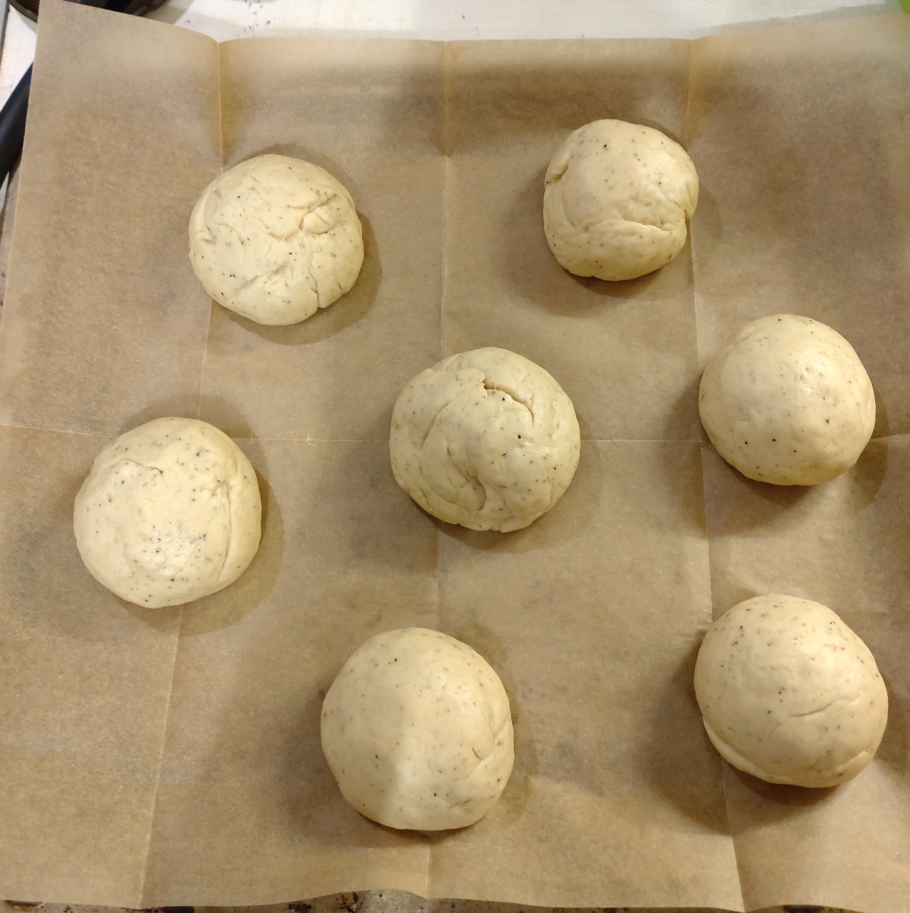 - クッキングペーパーを天板に敷き、ボール状の生地を乗せ、約10分間発酵させる。