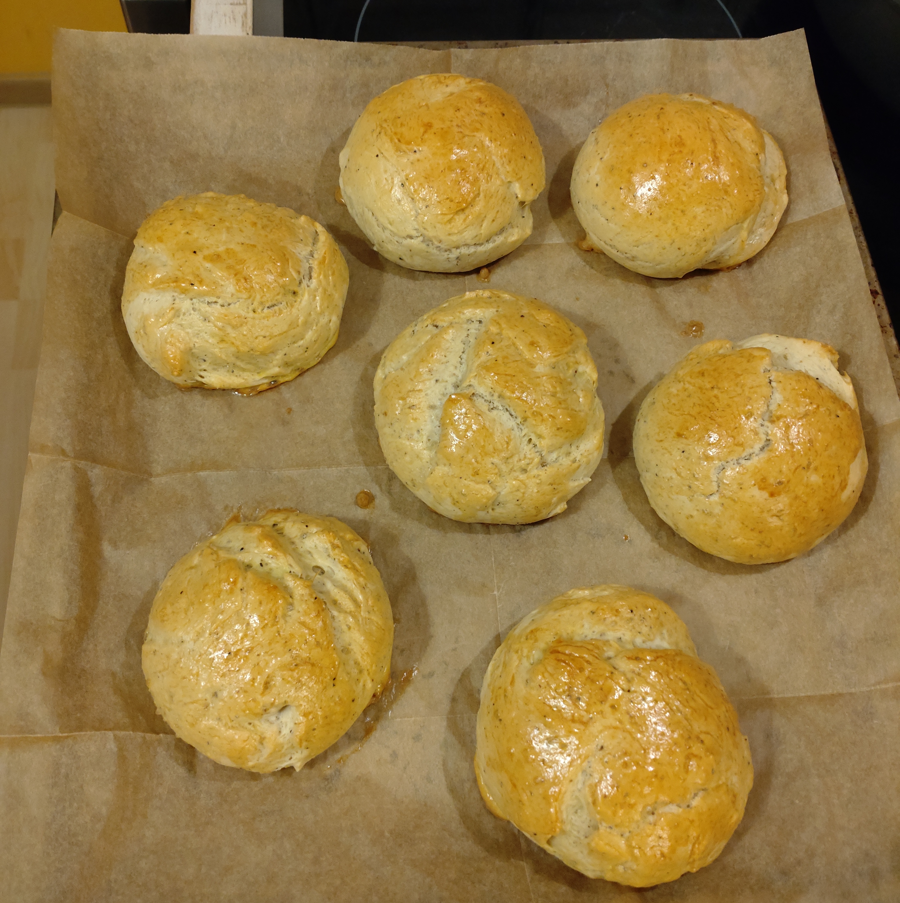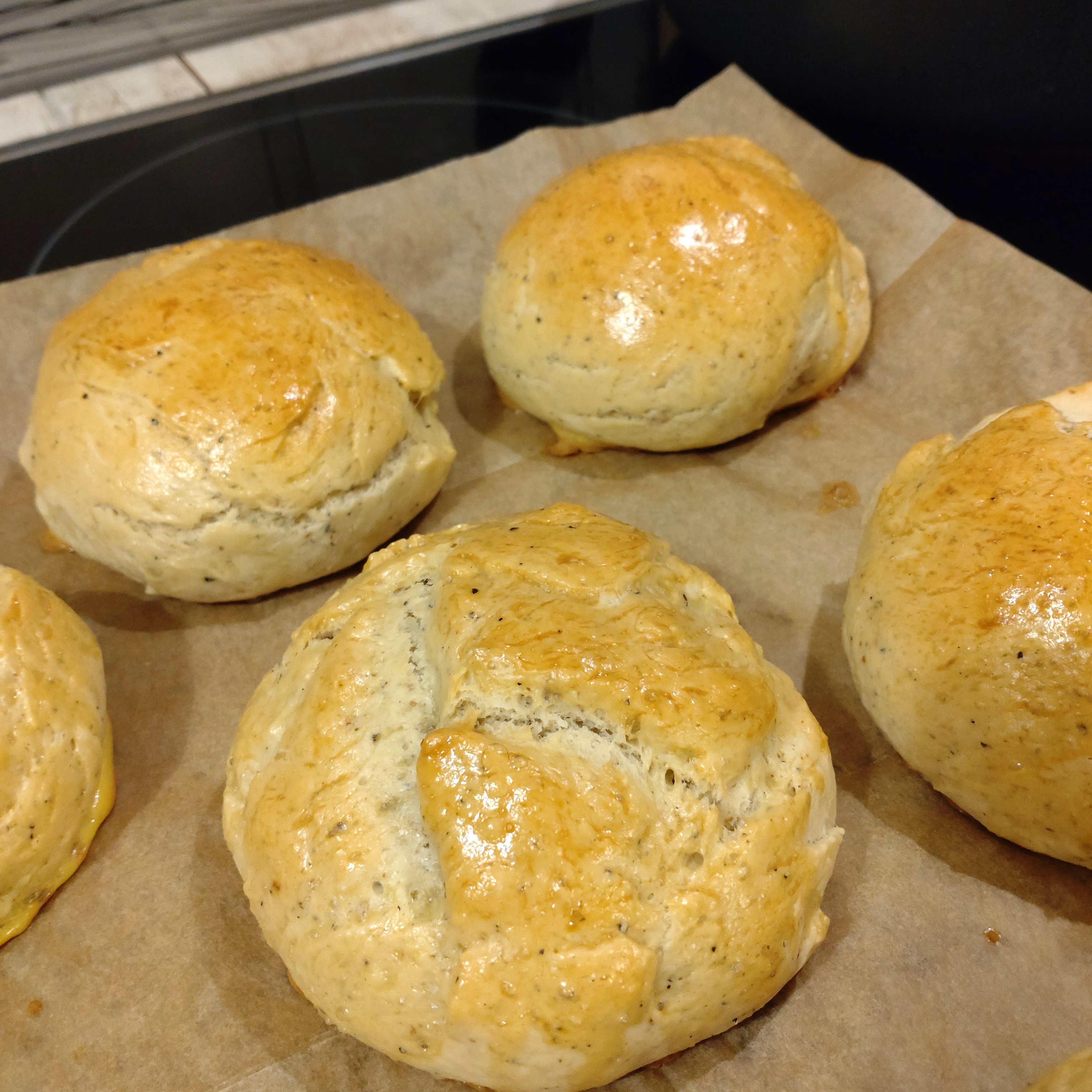 - バンズに溶き卵を塗り、180度のオーブンで、20~25分焼く。