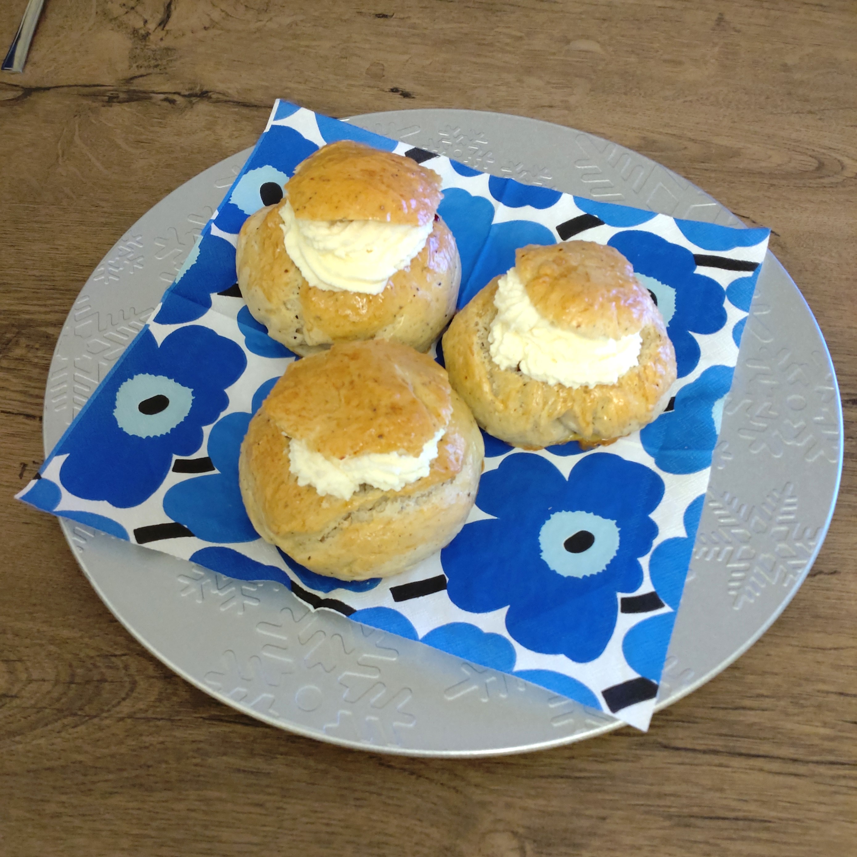 ヴァストラクッケルとは、カルダモンの入ったパン生地に、バンズの上部を切り取り、間にクリームをトッピングした、ペイストリーです。
