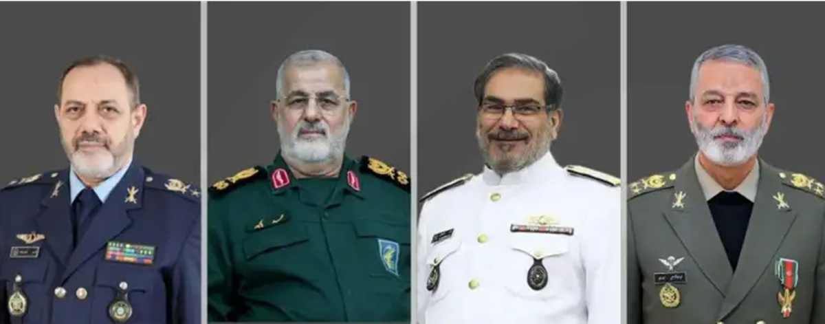 2月28日のイスラエル軍の攻撃で殉教したイランの軍関係者;右からムーサヴィー合同参謀本部議長、シャムハーニー最高指導者政治顧問(国防評議会最高指導者名代)、パークプール・イスラム革命防衛隊司令官、ナスィールザーデ国防軍需大臣