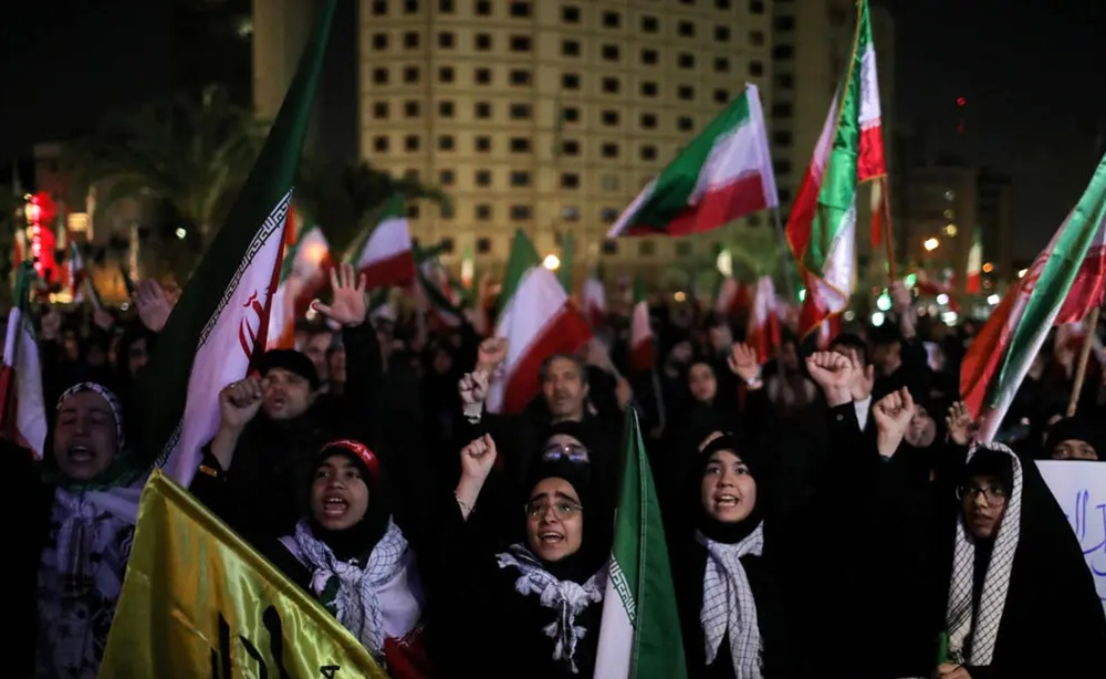 アメリカとイスラエルへの報復を主張し気炎を上げる女性たち;「侵略者に報復を」